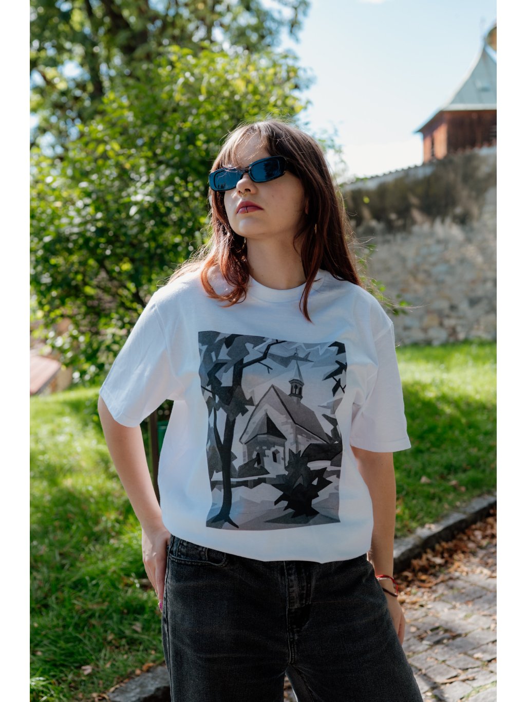 Triko s černobílou variantou malby chaberského kostela by legendary Jakub Trnka a.k.a. QEBE.
